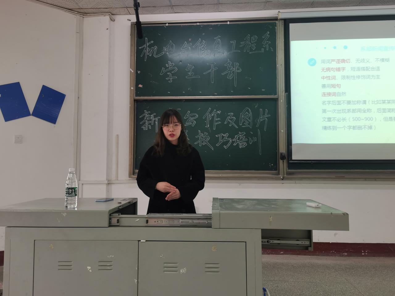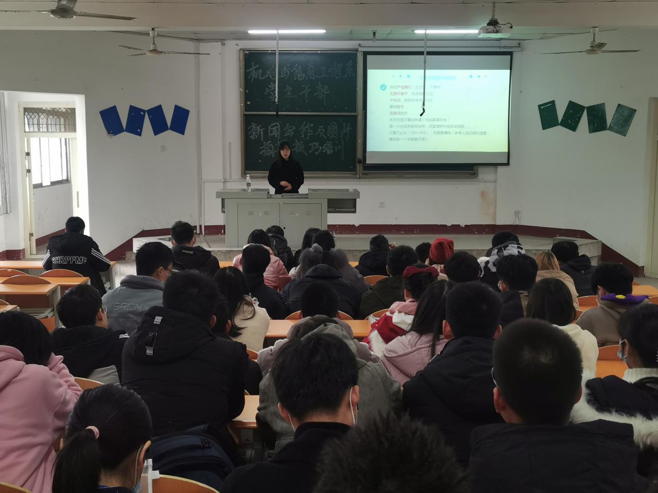 本网讯(学生记者 周晶晶)为进一步推进我系宣传工作,提升学生干部综合素质。11月26日中午,在四教200教室,我系开展学生干部新闻写作及图片拍摄技巧培训。活动由秘书处杨超主持,系辅导员陈质晶出席并担任主讲人,第十六届团学组织全体成员参加。