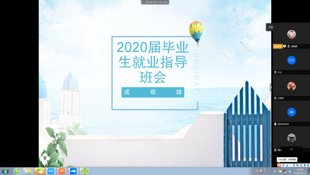 针对新型冠状肺炎疫情影响下的就业形势,5月15日晚上七点,在腾讯会议室,我系召开2020届毕业生就业指导班会。辅导员成观雄主持,2020届全体毕业生参加。