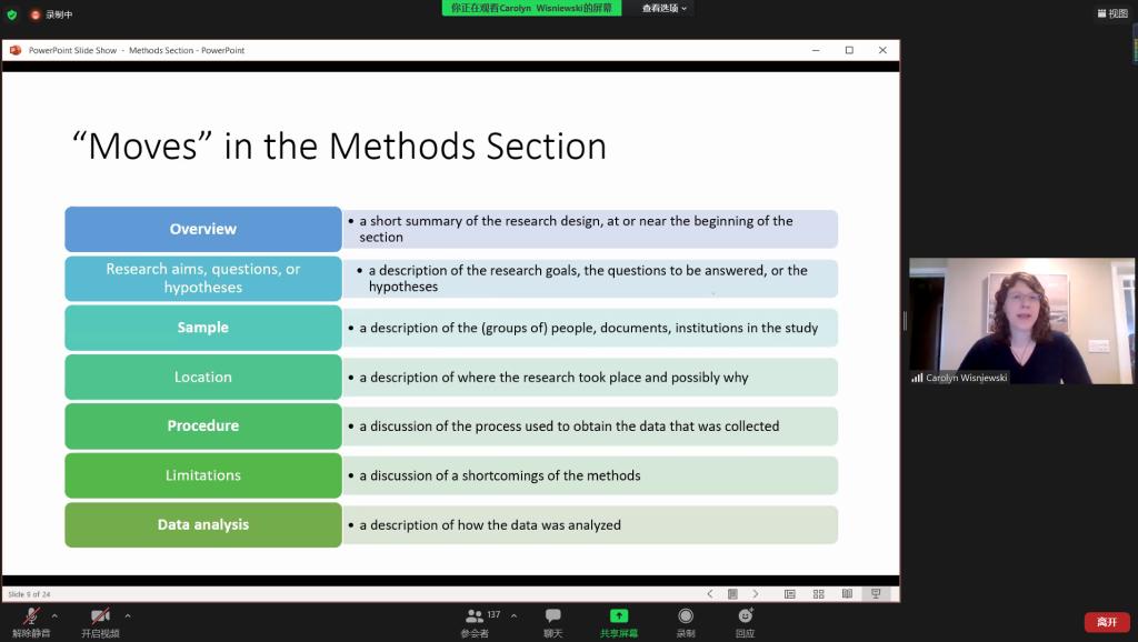 本网讯(学生记者 孙健博 谢东环)为提高同学们的学习兴趣,培养同学们的英文写作能力,第26个世界读书日,我系通过yl7703永利集团图书馆官网公告,在zoom平台上组织观看英文写作专题讲座。讲座由Shuyi Liu、Lian Ruan主持,伊大写作中心主任Carolyn主讲,我系全体同学参与。