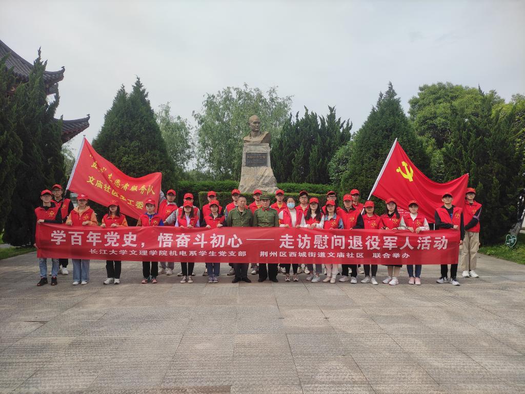 最后,全体成员与两位退役老兵一同前往荆州市三国公园陶静轩纪念碑前举行纪念仪式,宣读入党誓词,致敬革命前辈。在这庄严时刻,我们深知历史重任、革命情怀;我们谨记爱国之心、报国之志;不忘初心,牢记使命,追寻军人足迹、感悟伟人思想、学习革命精神。
