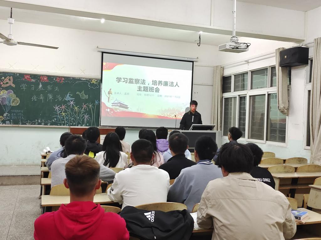 本网讯(学生记者 付思进)11月4日晚,我系各班开展“学习监察法,培养廉洁人”主题班会。班会由各班班长主持,班级全体同学参加。