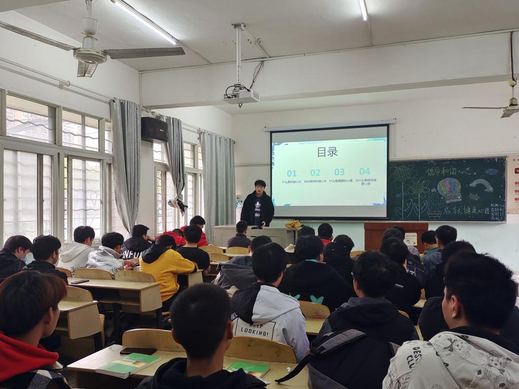 班会开始,主持人结合PPT和视频,从“当代大学生心理现状”、“大学生常见的心理问题”、“如何更好的适应大学生活”三个方面,向同学们阐述了产生心理问题的原因以及培养健康心理的办法。随后,主持人通过列举现实中心理疾病的危害,要求同学们及时处理学业、情感、人际关系上的问题,合理发泄负面情绪,缓解自身压力。最后,主持人呼吁同学们要时刻注意自己和他人的心理状态,及时解决问题,提前预防隐患。