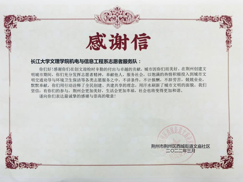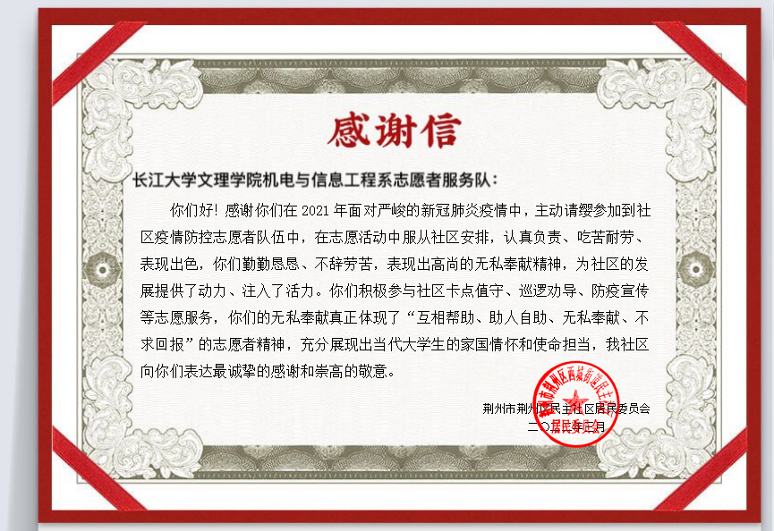 本网讯(学生记者 吴家佳)近日,荆州市民主社区和文庙社区向我系发来感谢信,对我系志愿者给予了高度认可。