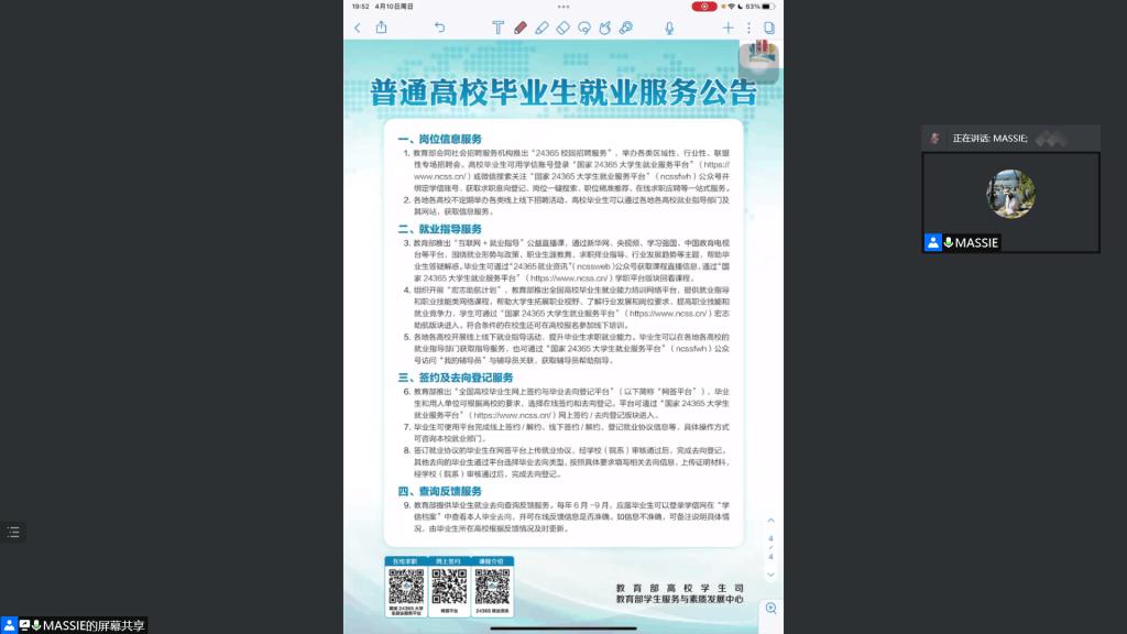 线上宣讲会由辅导员燕梦蝶主持,我系2022、2023届毕业生参加。会议上,主持人围绕“应征入伍”、“基层就业”、“自主创业”、“就业服务”四个方面进行讲解,为同学们列举了毕业后的多种选择,介绍了国家的各项优惠政策。她希望同学们找准自身定位,提升专业技能;积极投身实践,逐步累积经验;合理利用资源,做好未来规划,做到边听边学边进步,不断丰富自身履历。最后,她提醒同学们主动了解毕业生就业的相关政策,加强与老师的沟通交流,使自己做到心中有数。