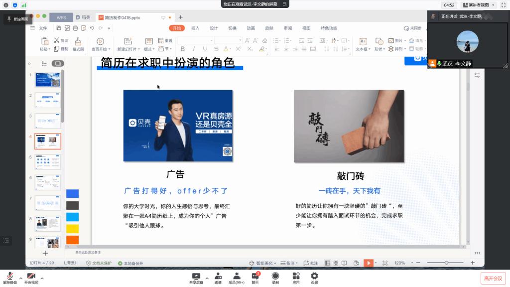 本网讯(学生记者 湛点)4月18日中午,在腾讯会议平台上,我系开展简历制作技巧线上培训会议。会议由武汉贝壳校园招聘部经理李文静主持,我系19级学生参加。