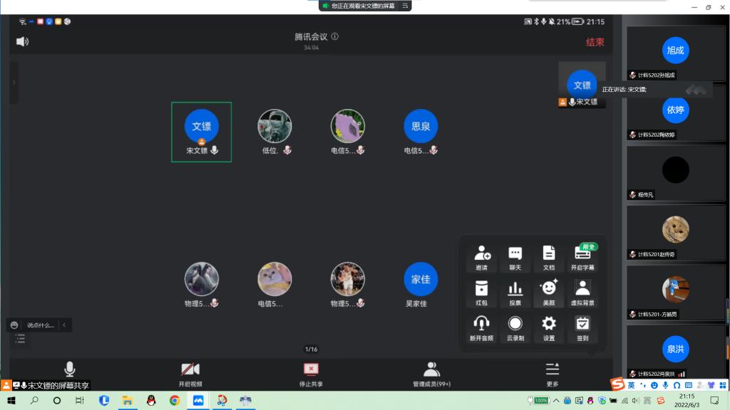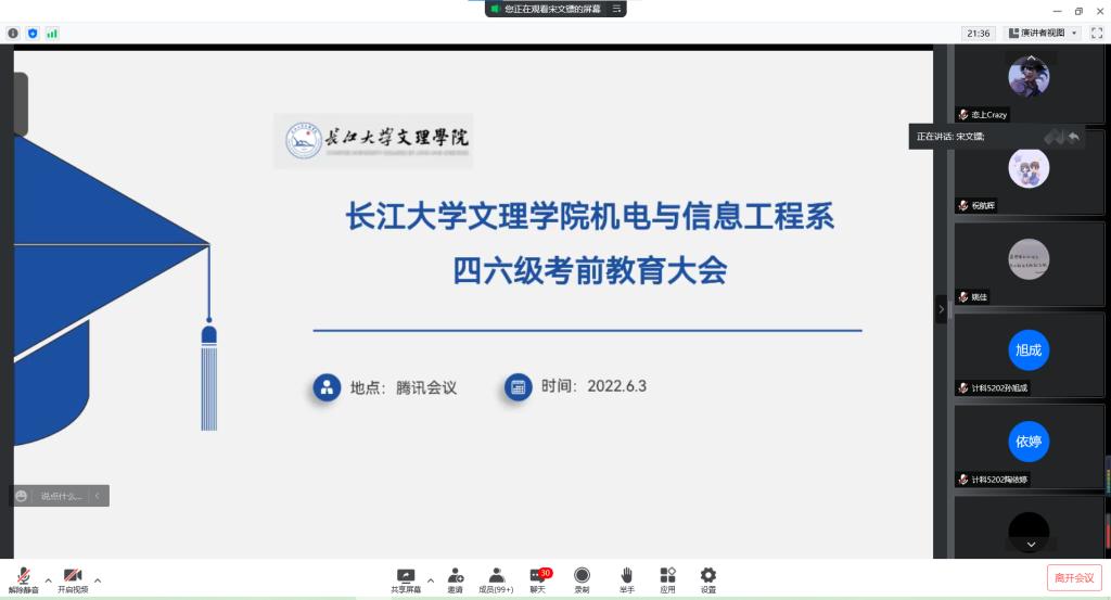 本网讯(学生记者 湛点)为激发同学们的学习积极性,提高同学们的考试通过率,6月3日晚,我系以线上的形式开展了大学四六级诚信考试教育大会。会议由辅导员宋文镖主持,我系大二、大三全体同学参加。
