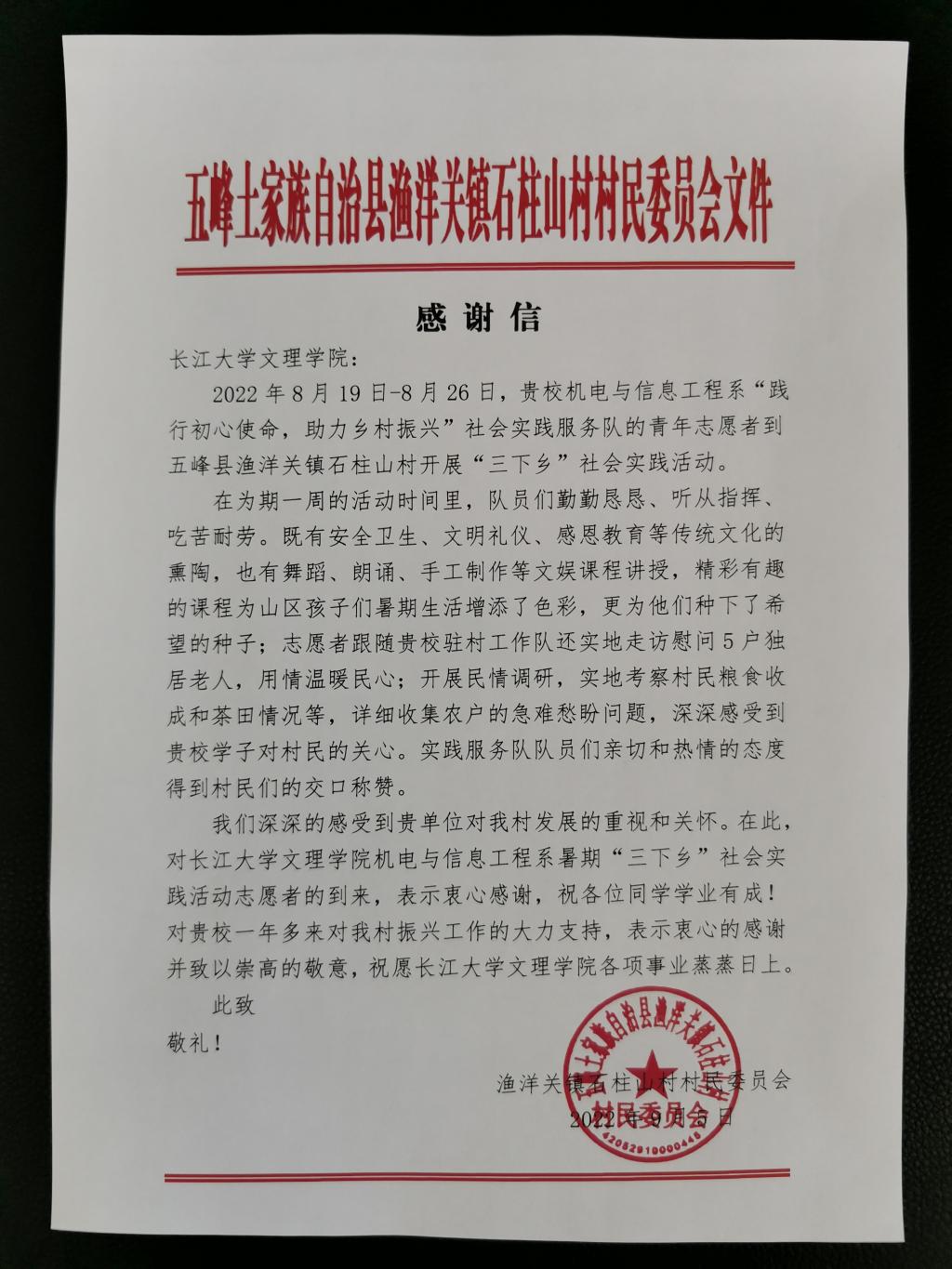 本网讯(记者 毛志豪 朱琦棋)9月5日,yl7703永利集团机电与信息工程系社会实践服务队收到了来自宜昌市五峰县渔洋关镇石柱山村村委会的感谢信。信中对该社会实践服务队在本次活动中的辛勤付出表示感谢。8月19日到8月26日,社会实践服务队在成观雄老师的带领下来到了五峰县石柱山村,开展本次“三下乡”活动。社会实践服务队给石柱山村的孩子们带来了丰富多彩的课堂内容和生动充实的趣味活动,助推教育振兴;开展民情调研,了解并宣传当地风土民情,助力乡村振兴;为实施乡村振兴战略和构建基层治理新格局培养后备人才,增强社会责任;以实践行动传递爱心温情,增强当代青年大学生的责任与担当意识;协助村委会举办文艺汇演,宣传民族特色,引领文化振兴。