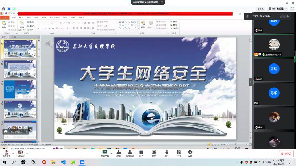 本网讯(学生记者 王艺果)9月7日晚,我系开展了大学生校园网络安全文明主题班会。班会由辅导员主持,各班全体同学参加。