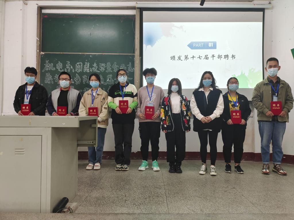 会议开始,主持人致开幕词。六位辅导员依次上台为十七届主席团、部长代表、干事代表颁发聘书。