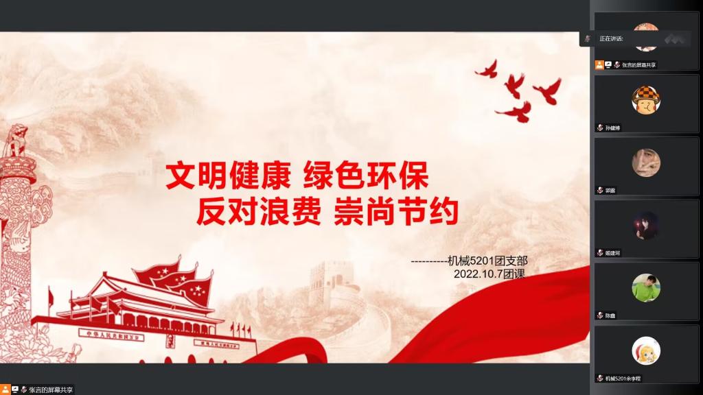 本网讯(学生记者 徐果)近日,我系开展“文明健康 绿色环保,反对浪费 崇尚节约”线上主题团课。团课由各班团支书主持,班级全体同学参加。