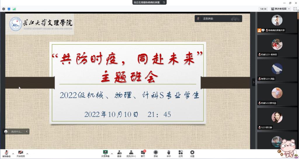 本网讯(学生记者 张瑞琦 李学哲)为了进一步做好疫情防控工作,提高学生的疫情防控知识,确保各项工作有效落实,10月10日,我系开展“共防时疫,同赴未来”校园防疫主题班会。会议由辅导员主持,我系各班同学参加。