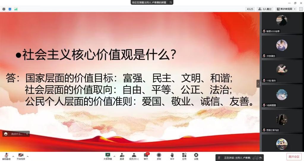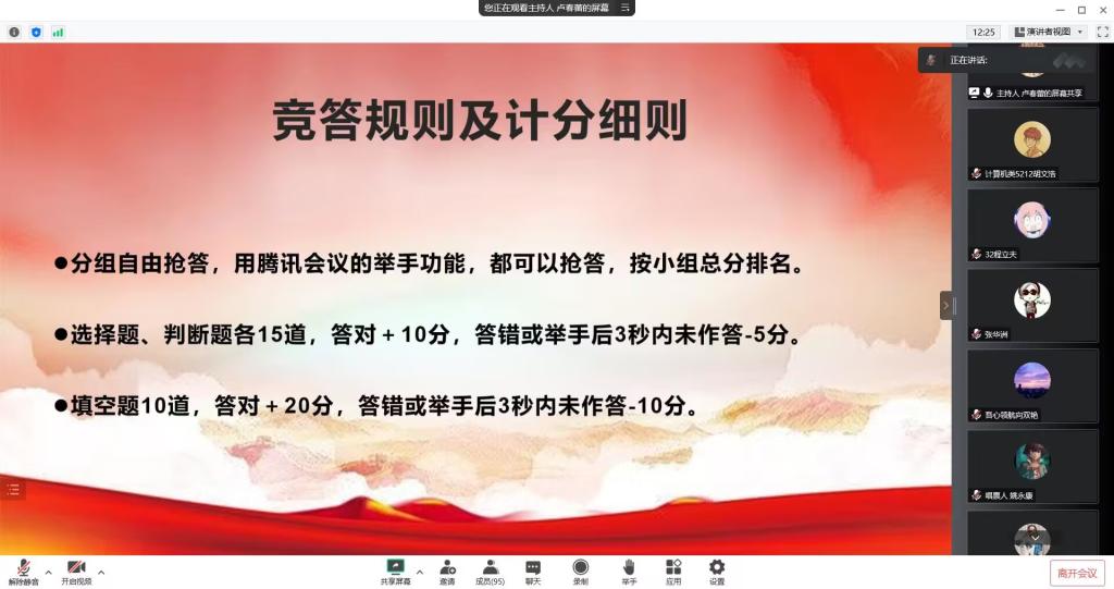 在知识竞答活动中,参赛选手们仔细思考、准备充分、配合默契、沉着答题,在腾讯会议上利用举手功能进行抢答,力争取得佳绩。根据选手们的答题成绩,最终比赛成绩揭晓:第18组洪岩、李浩、彭浩文获一等奖,第2组王崇林、张靖宗、黄家炜和第11组周桂香、覃真妮、程伶获二等奖,第1组李毅、孙前、程俐,第19组吴嘉丽、刘雨霏、陈佳玲和第30组刘泓呈、杨家乐、余书宏获三等奖。