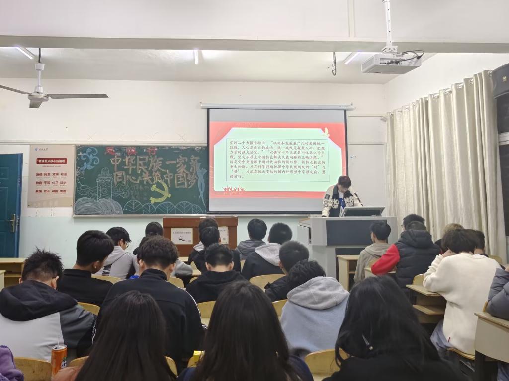 团课开始,主持人通过播放PPT,围绕民族工作的“重要思想”、“工作主线”、“重大意义”三个方面,向同学们分析了做好民族工作的重要性和必要性,倡导同学们学习中央民族工作会议精神。随后,主持人邀请同学们上台发表自身感悟,物理5222班李潇杰同学说道:“我们要必须坚持中华民族历史观,增强对中华民族的认同感和自豪感,为中华民族复兴贡献一份力量。”