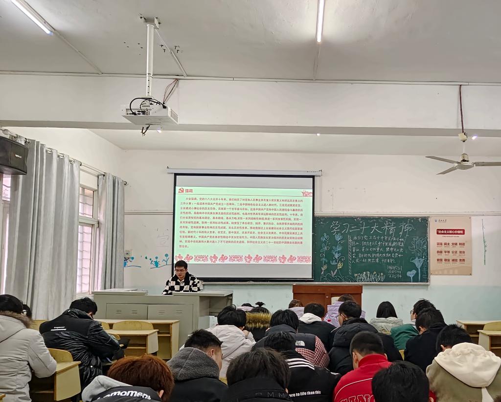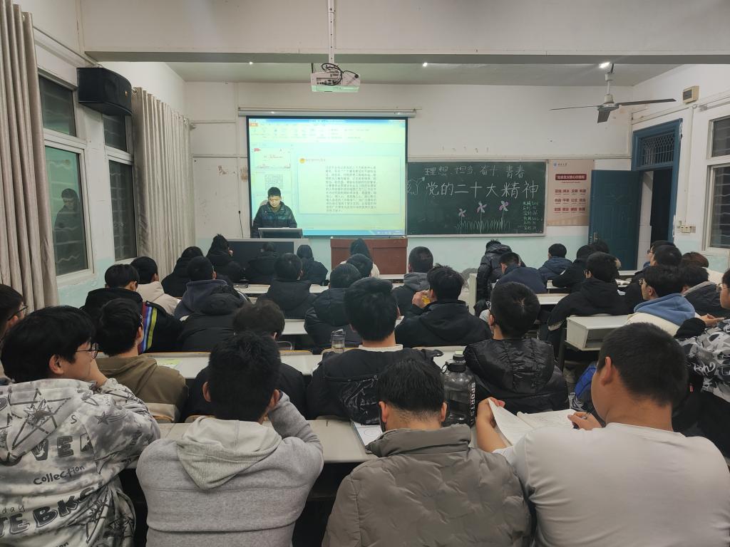 团课开始,主持人通过PPT的形式,结合习近平总书记在党的二十大报告中提出的相关内容,带领同学们回顾了党的二十大主题,重温了党的二十大的重点内容,深入分析了新青年应怎样学习领会党的二十大精神。随后,主持人邀请同学们发表自身感悟,并总结道:“我们应当跟随党的思想脚步,一步一步、稳扎稳打地肩负起时代赋予的重任,努力成为可堪大用的栋梁之才。”