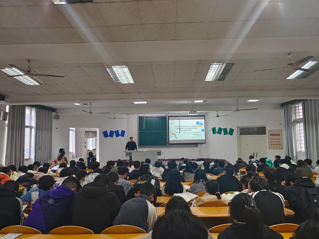本网讯(学生记者 张瑞琦)为了激发学生对物理学科的钻研热情,培养学生的物理学科素养,3月23日中午,在西校区四教200教室,我院开展首届物理实验创新设计竞赛暨第八届湖北省大学生物理实验创新设计竞赛选拔赛宣讲会。会议由我院秘书处沈淼然主持,我院党总支副书记成观雄、副教授王乐出席,我院大一、大二、大三物理专业学生及各班学委参加。