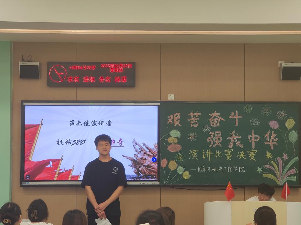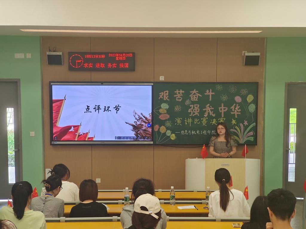 本网讯(学生记者 杨天磊)为深入学习贯彻党的二十大精神,教育引导广大团员青年继承光荣传统、肩负强国使命,用青春汗水书写新时代新征程奋斗篇章,4月20日下午,我院于A-110教室举行“艰苦奋斗,强我中华”演讲比赛决赛。比赛由秘书处贺博主持,辅导员燕梦蝶、王妍柳出席并担任评委,我院部分同学聆听。