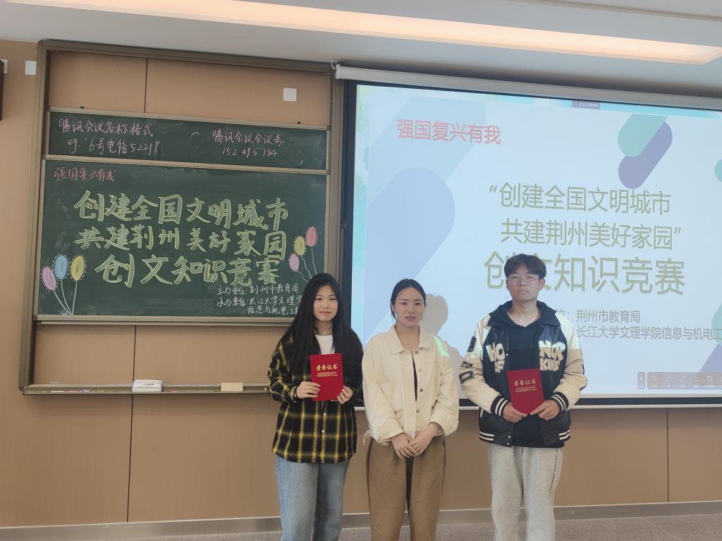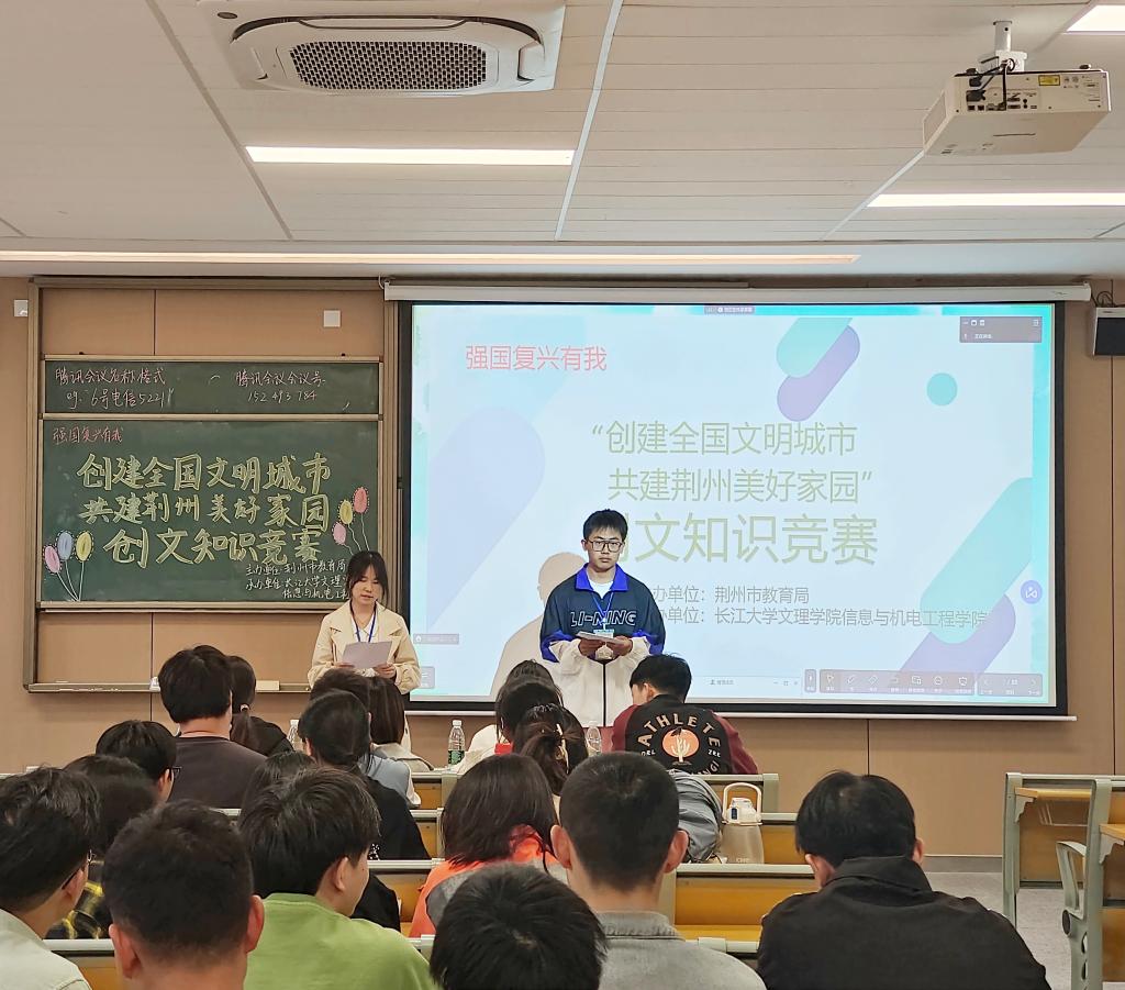 本网讯(学生记者 朱毅林)为宣传引导学生学习文明礼仪知识、践行文明行为规范、争做文明市民,5月4日中午,在A栋208M教室,我院开展“创建全国文明城市,共建荆州美好家园”知识竞赛。竞赛由秘书处王子瑞、沈淼然主持,辅导员陈晓倩、王妍柳出席,我院部分同学参加。