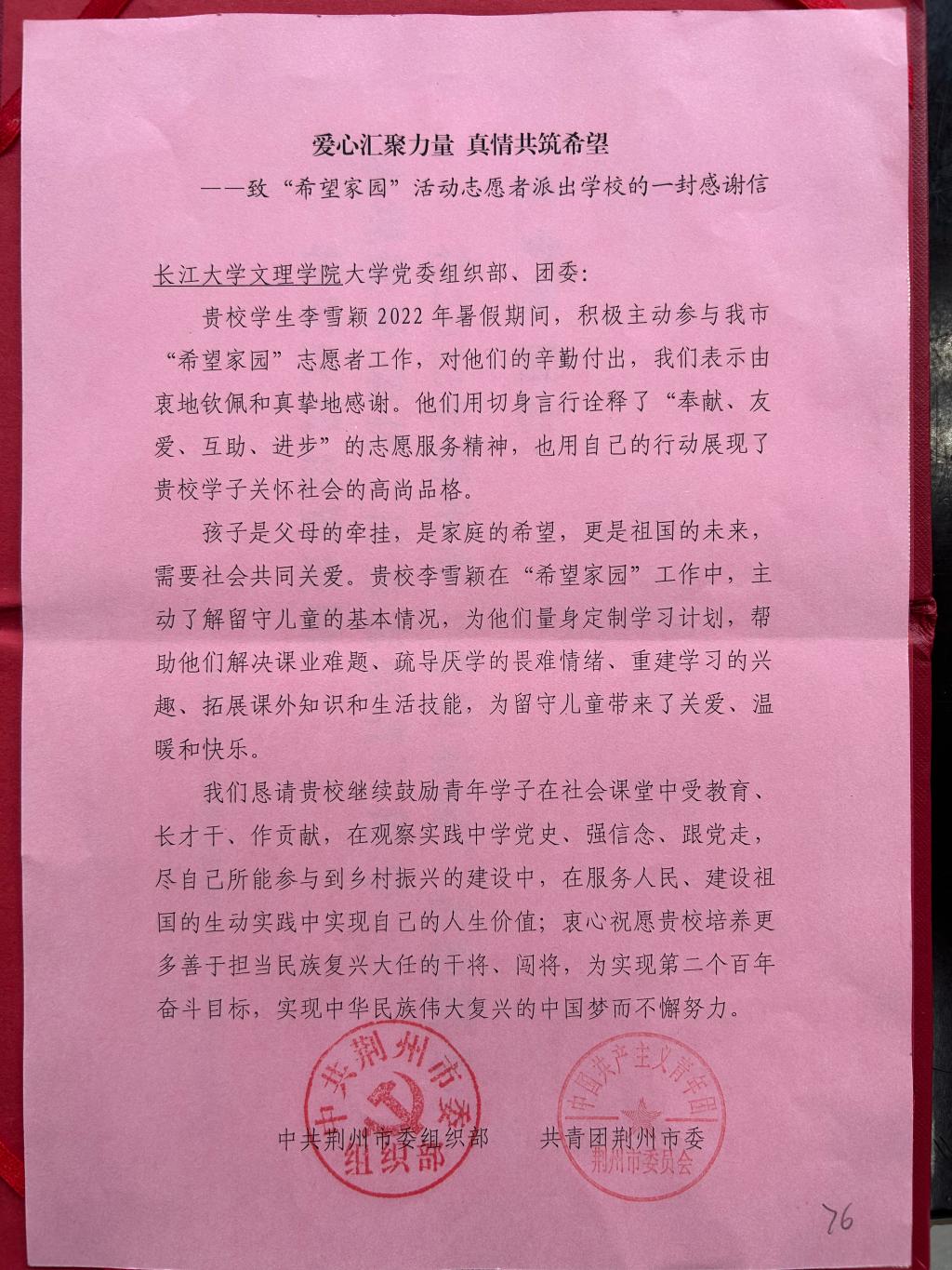 本网讯(记者 王妍柳)5月10日,我院收到了来自荆州市委组织部的一封致“希望家园”活动志愿者派出学校的感谢信。信中对我院学生李雪颖2022年暑假期间积极主动参与我市“希望家园”志愿者工作表示赞许,对其工作期间的辛勤付出表示由衷地钦佩和真挚地感谢。