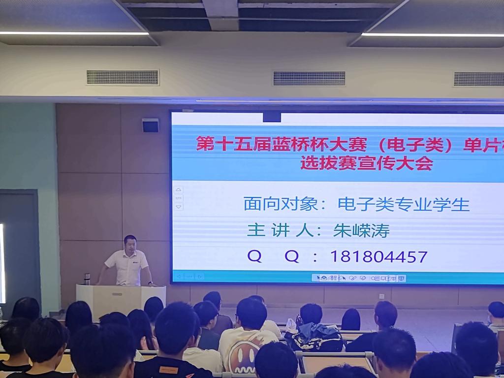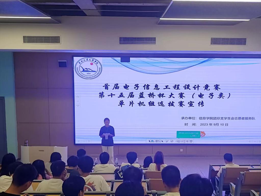 本网讯(学生记者 李学哲)9月14日下午,我院于B-214S教室开展首届电子信息工程设计竞赛暨第十五届蓝桥杯大赛(电子类)单片机组选拔赛宣传,会议由秘书处贺博主持,我院常务副院长陈希湘、党总支副书记王大专、专任教师朱嵘涛、何朝霞、潘小红、李相敏出席,我院大二、大三电子信息工程专业学生及各班学委参加。