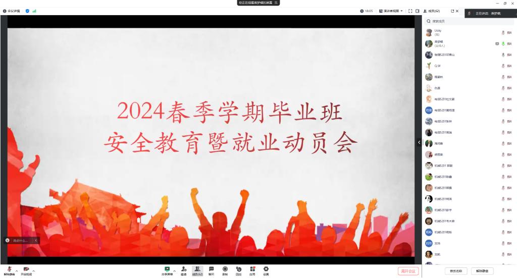 本网讯(学生记者 徐可)为扎实推进就业育人工作,提高毕业生校外实习、求职安全意识,帮助毕业生转变就业观念,增强安全防范意识, 3月12日我院以线上腾讯会议的形式开展2024春季学期毕业班安全教育暨就业动员会,会议由辅导员燕梦蝶主持,2024届毕业班全体学生参加。