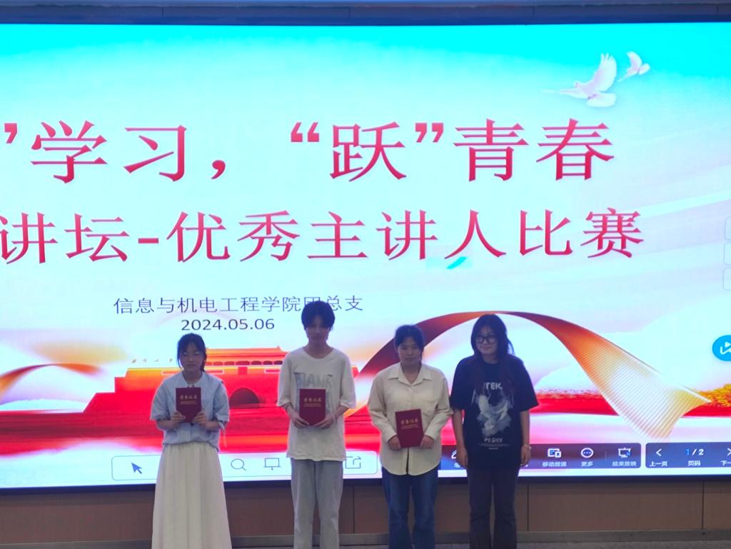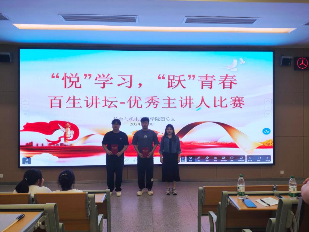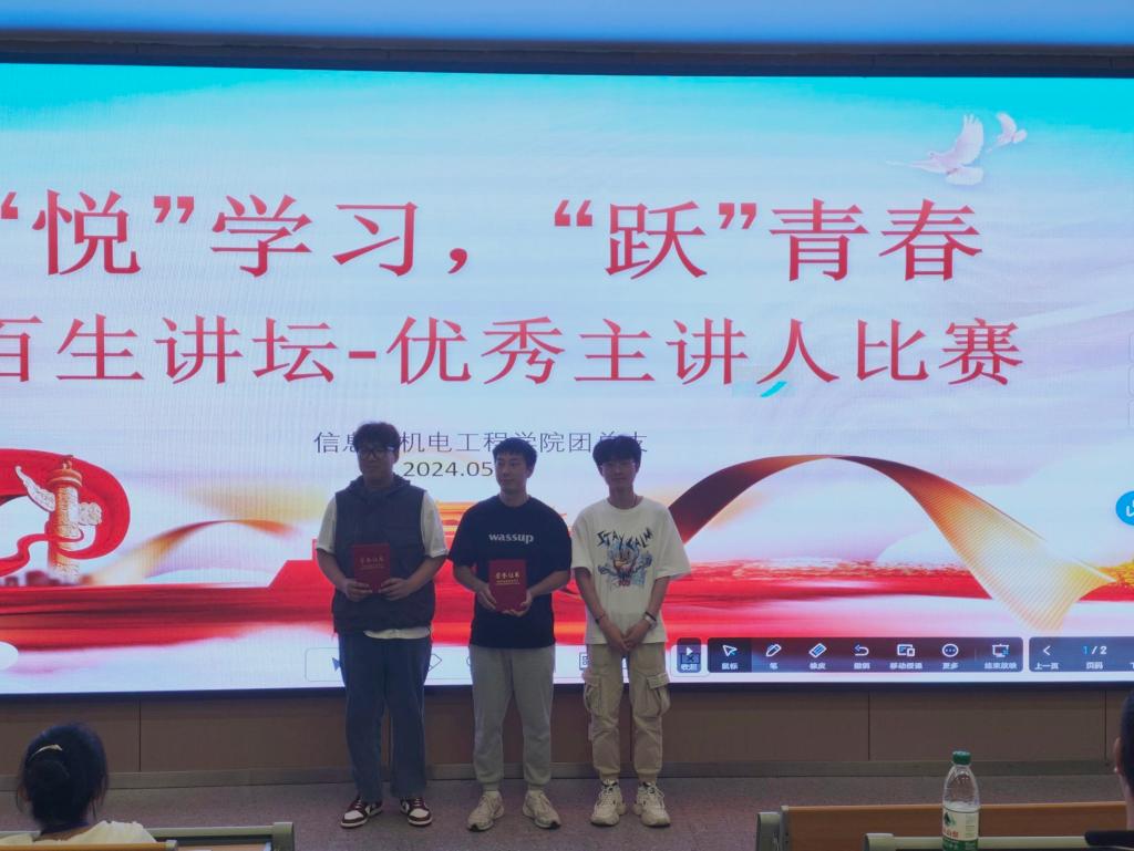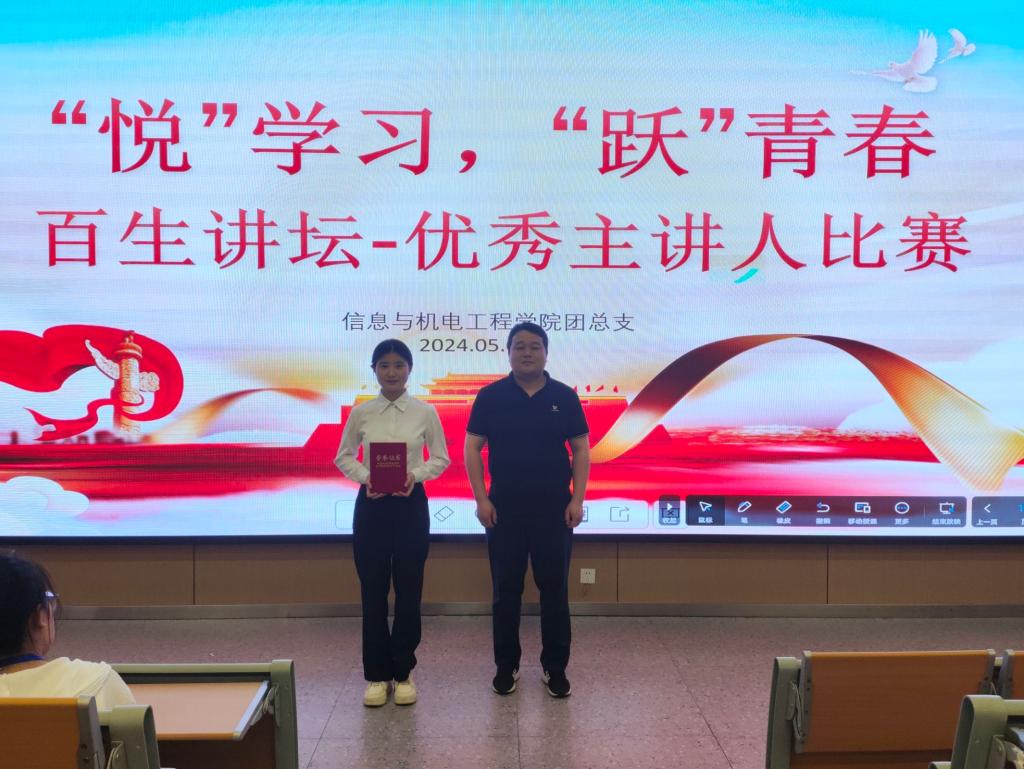 本网讯 (通讯员 杨珺涵/文 刘吉文/摄) 5月6日晚我院于B-214开展“‘悦’学习,‘跃’青春”百生讲坛——优秀主讲人活动。本次活动由我院学生会组织部吴诗琪主持,我院党总支副书记王大专、辅导员燕梦蝶参加。