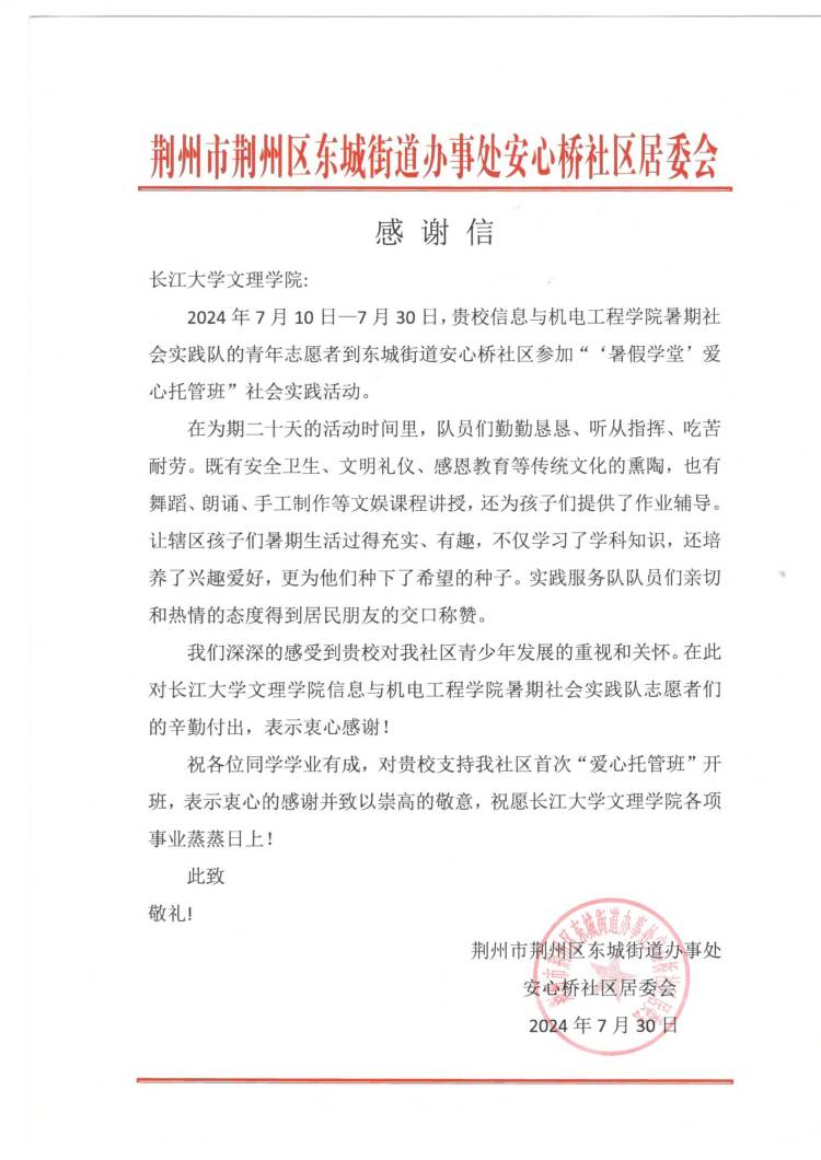 荆州区东城街道办事处安心桥社区居委会近日向学院寄来感谢信和感谢状,信中对我院社会实践服务队的辛勤付出、卓越表现给予了高度的肯定和赞扬,并对我校给予社区青年发展的重视和关怀表示感谢。