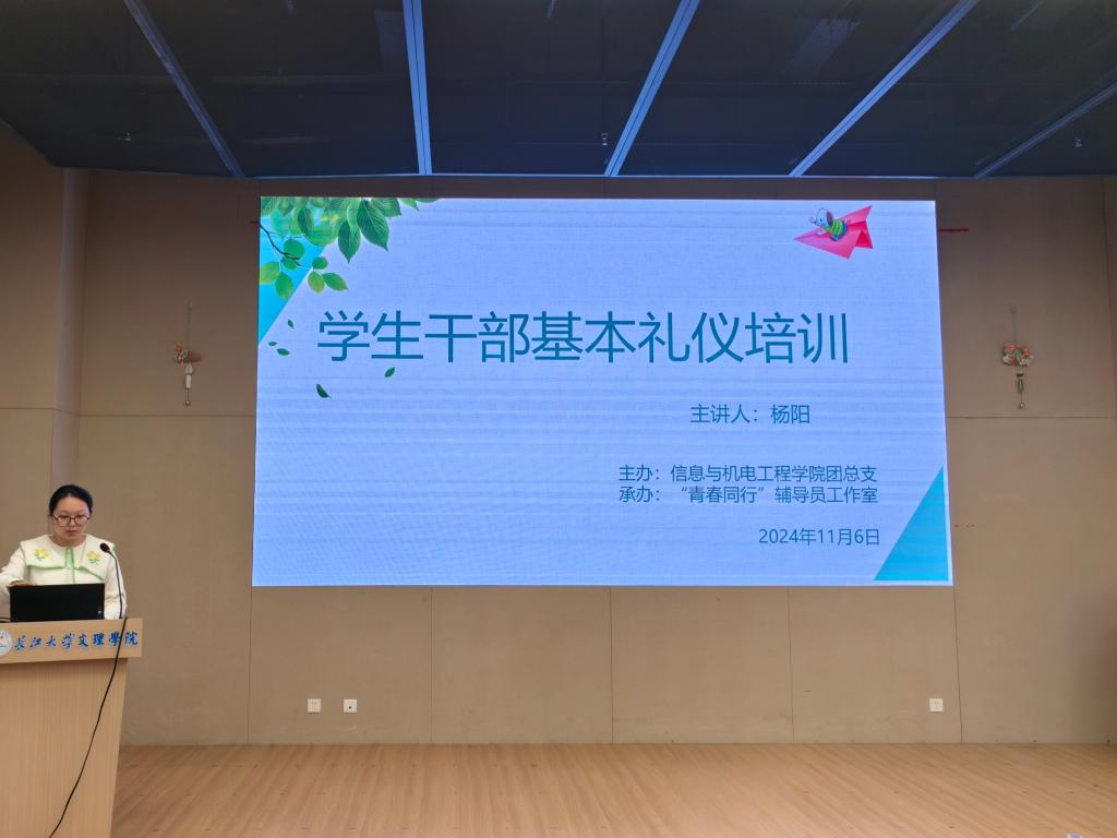 会议伊始,主持人致开场词并介绍到场嘉宾。杨阳老师就学生会工作场景与日常礼仪问题进行讲解,从办公室礼仪、电话礼仪及活动礼仪等方面提出要求,强调整洁而不过分修饰的仪容仪表是学生会开展工作的重要前提。