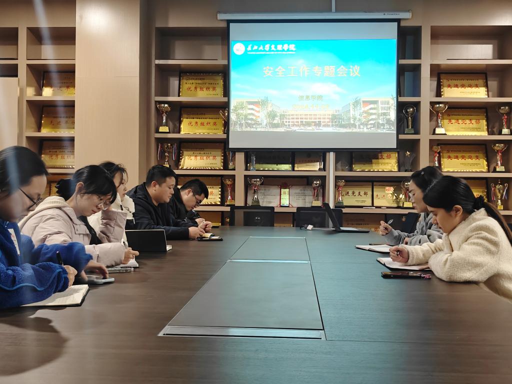 网讯(通讯员 王妍柳/文 王盛博/摄)为进一步强化校园安全管理,落实学校安全工作责任,维护和谐稳定的校园环境,11月25日,我院于信息学院会议室召开安全工作专题会议,我院党总支副书记王大专主持会议,各年级辅导员参加会议。