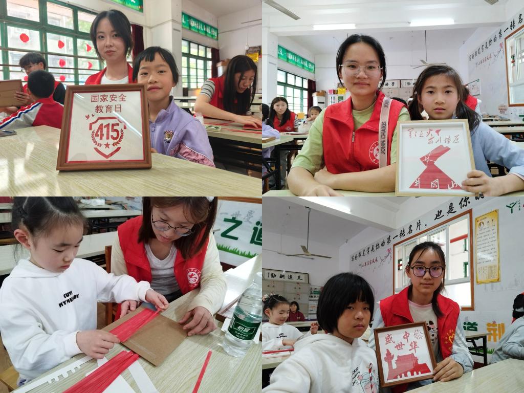 活动中,崔雪婷同学围绕全民国家安全意识、法律意识两个方面给现场小朋友们进行讲解,她号召大家积极树立国家安全意识,做到“知法、尊法、守法”。王石龙同学给小朋友们讲授防范诈骗的技巧,他告诫小朋友们“天上不会白掉馅饼”,生活中一定要“擦亮眼睛”。活动尾声,学生志愿者们与现场的小朋友们一起动手制作非遗竹编,共同感受中华优秀传统文化的魅力。