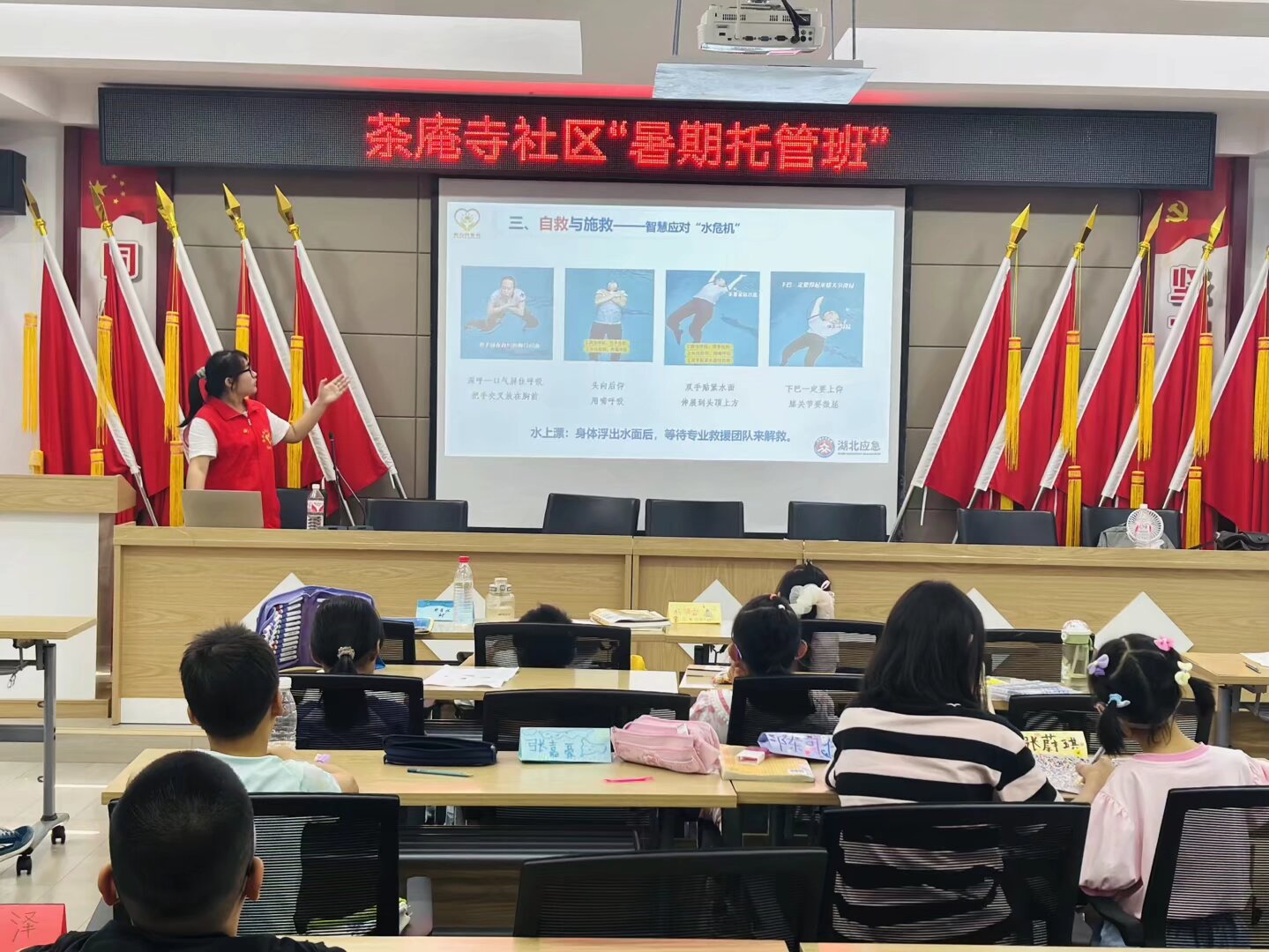 7月8日,思源之家服务队全体成员参加茶庵寺社区“暑期托管班”开班仪式,在场家长纷纷表示“托管班终于开班啦,还有大学生志愿者助阵,我们家的孩子又多了一个好去处”,开班结束后,志愿者鲁盼同学以“珍爱生命,严防溺水”为主题,为孩子们带来了生动实用的安全知识讲解。她结合夏季溺水事故高发的特点,用通俗易懂的语言讲解了易发生溺水的危险区域、溺水后的自救方法,以及发现他人溺水时的正确施救原则。