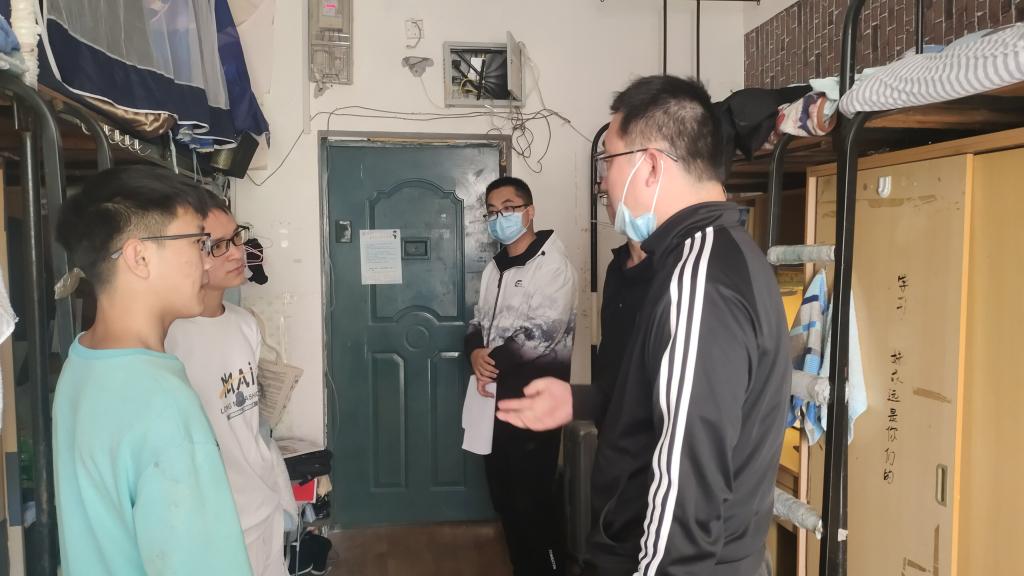 本网讯10月10日下午,机电系副主任呙明辉和辅导员朱亦丹深入学生寝室与同学们亲切交谈,要求学生严格遵守学校疫情防控政策,按时按点进行核酸检测,做好疫情防护,保护个人健康;仔细询问了学生上网课的情况,提醒同学们及时调整生活作息,认真上好网课;对于毕业班同学询问了其考研、就业情况,在疫情防控期间,珍惜时间,做好毕业论文的选题及撰写工作;用心叮嘱同学们注意安全用电,强化安全意识,注意维护宿舍卫生,营造温馨舒适的学习生活环境,以积极的心态面对疫情,加强身体锻炼和心理疏导,做到理解、支持、配合!相信荆州一定能战胜疫情!