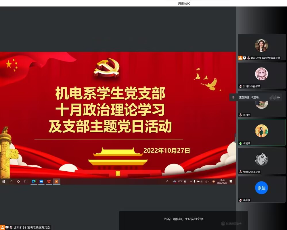 本网讯(学生记者 张志宏)10月27日下午,根据疫情防控要求,在腾讯会议,我系学生党支部开展10月份政治学习和“支部主题党日”活动。会议由张明欣同志主持,学生党支部书记成观雄出席,支部全体党员参加。