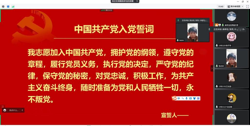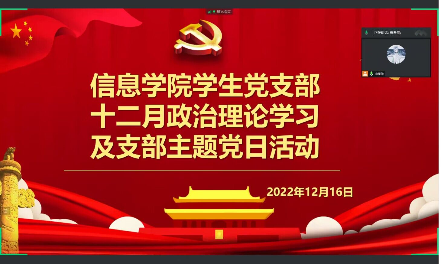 本网讯(学生记者 张志宏)12月16日下午,在腾讯会议,我院学生党支部开展12月份政治学习和“支部主题党日”活动。会议由曲孝佳同志主持,学生党支部书记成观雄出席,支部全体党员参加。