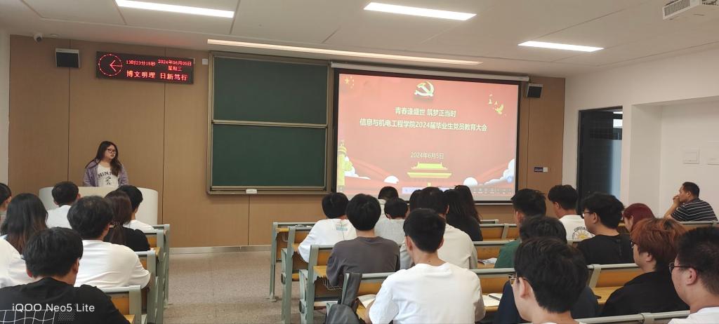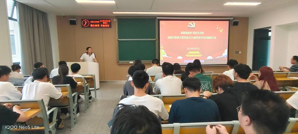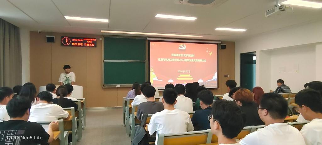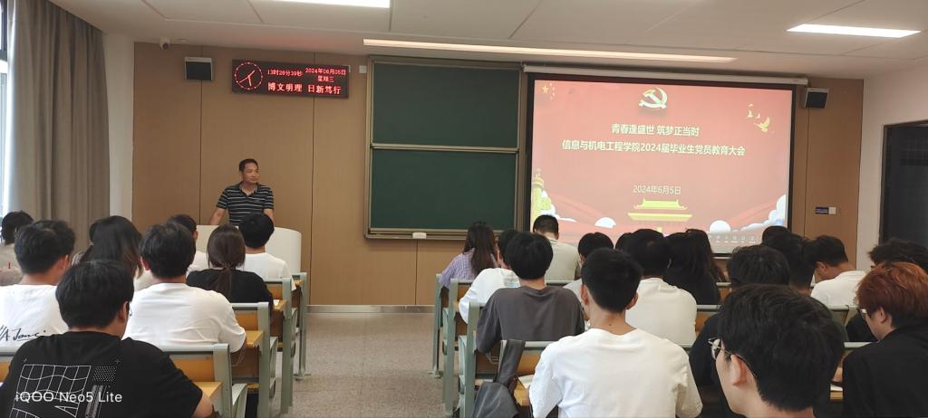 本网讯 (通讯员 孟娜/文 孟娜/摄) 为进一步强化毕业生党员教育,激励毕业生党员坚定理想信念、牢记党员的身份,帮助毕业生党员做好从学校到社会的角色转变,6月5日,我院于A-208教室开展“青春逢盛世,筑梦正当时”2024届毕业生党员专题教育,我院党总支书记吴海良、学生党支部书记王大专、毕业生辅导员出席,全体毕业生党员参加。