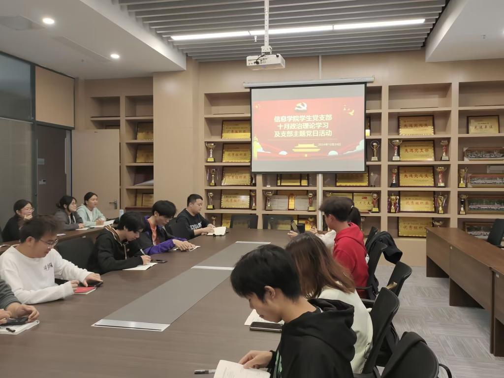 本网讯(通讯员 周爱娟/文 周爱娟/摄)10月24日中午,学院学生党支部于信息学院会议室开展10月份政治学习和“支部主题党日”活动,会议由代阳同志主持,支部全体党员参加。