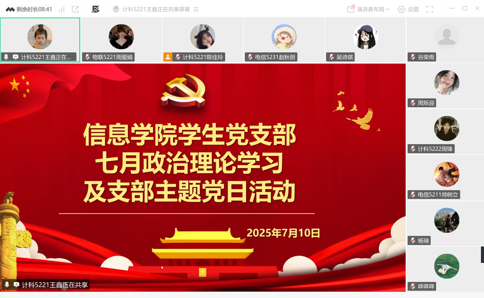 本网讯(通讯员 周爱娟)7月10日晚7点,信息学院学生党支部线上召开会议,开展7月份支部主题党日活动,会议主题是“持续推动深入贯彻中央八项规定精神学习教育走深走实”。会议由王鑫同志主持,学生支部全体党员参加。