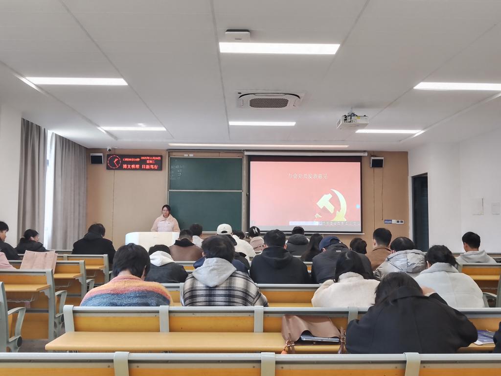 最后,辅导员王妍柳对顺利转为正式党员的5名同志表示热烈祝贺。她指出,预备党员转为正式党员,不仅是身份的转变,更是责任与担当的升华,5名同志在预备期间,始终以党员标准严格要求自己,在思想上主动向党组织靠拢,在工作中勇挑重担,在服务群众中践行初心,展现了良好的党员素养和精神风貌。针对全体党员,她提出明确要求,一要筑牢思想根基,始终把讲政治摆在首位,不断提高政治判断力、政治领悟力、政治执行力;二要严守纪律规矩,时刻以党章党规党纪为行为准则,做到心有所畏、言有所戒、行有所止;三要强化担当作为,立足本职岗位,主动投身中心工作,以“功成不必在我”的境界和“功成必定有我”的担当,展现党员的先锋模范作用。