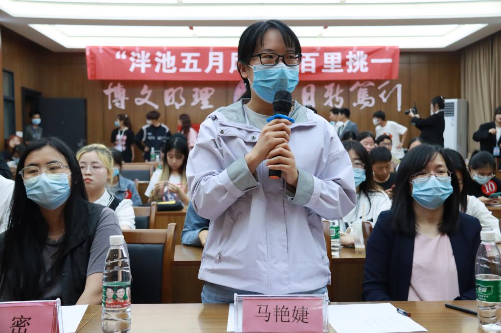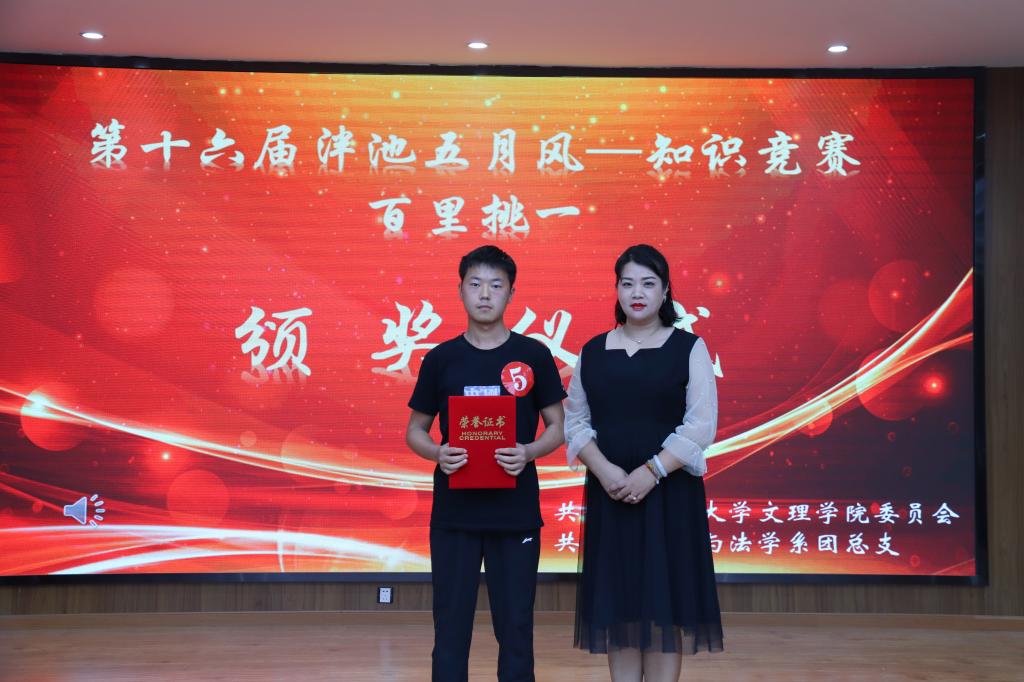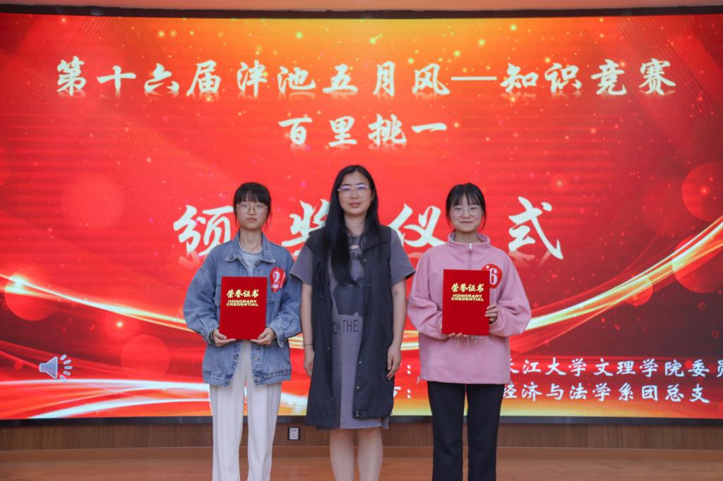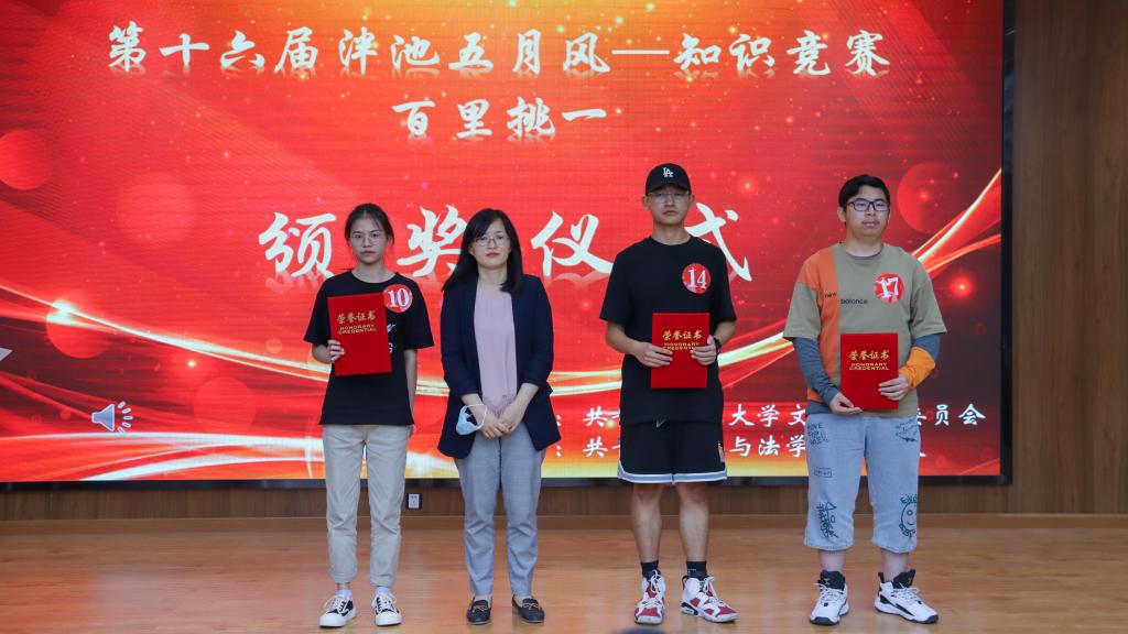 本次比赛奖项设有一等奖一个,二等奖两个,三等奖三个,优秀奖三个。经过初赛的比拼,共有17位同学跻身决赛。17位同学经过决赛的三轮比拼,最终由中文类5202李龙龙同学获得一等奖,金融5201李宁薇同学、计科5201吴家佳同学并获二等奖,中师5205陈源同学、注会5192谭晓雪同学、计科5191程璇同学并获三等奖,金融5201陈胤企同学、外语5212兰亚琪同学、应心5211詹柯同学并获优秀奖。杨杉杉老师、周密老师、马艳婕老师、王颖老师分别为获奖同学颁奖。