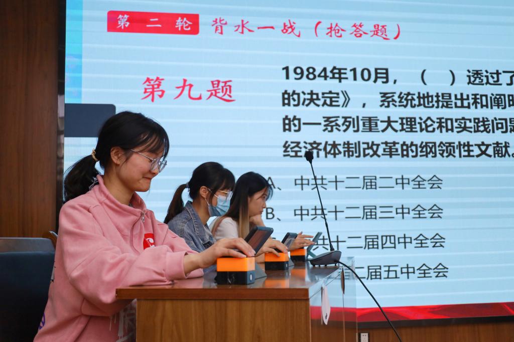 本次比赛紧扣“喜迎二十大,奋进新征程”,由必答题、抢答题和最终题库三部分组成,采用累积计分制,旨在丰富永利集团生活,拓展大学生课外知识,在封校期间让同学们释放学习压力,增加课外娱乐性。使大学生在知识、能力和素养方面得到协调发展。同学们随着抢答器的提示音,激动又紧张,逐渐被带动跟着选手一起做题、学习,活动进行到高潮,现场学习氛围浓厚,不时响起热烈的掌声。