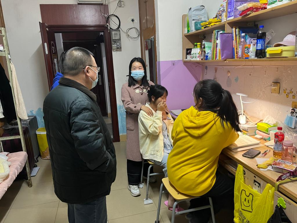 本网讯(见习记者 李欣怡 田琼钕 夏雪飞)为进一步做好疫情防控期间的教育安抚工作,落实各项工作管理措施,2022年10月9日晚经法系党总支书记李成军和辅导员文国霞、卢佳智老师前往学生宿舍看望慰问学生,切实关心系部重点关注学生。
