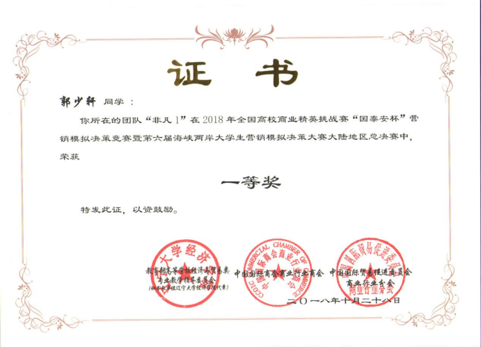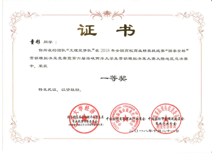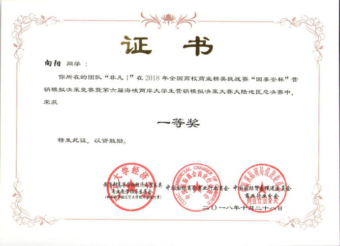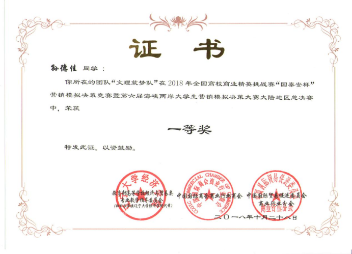 全国高校商业精英挑战赛“国泰安杯”营销模拟决策竞赛暨第六届海峡两岸大学生营销模拟决策大赛大陆地区总决赛 一等奖