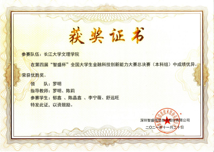 第四界“智盛杯”全国大学生金融科技创新能力大赛总决赛优胜奖