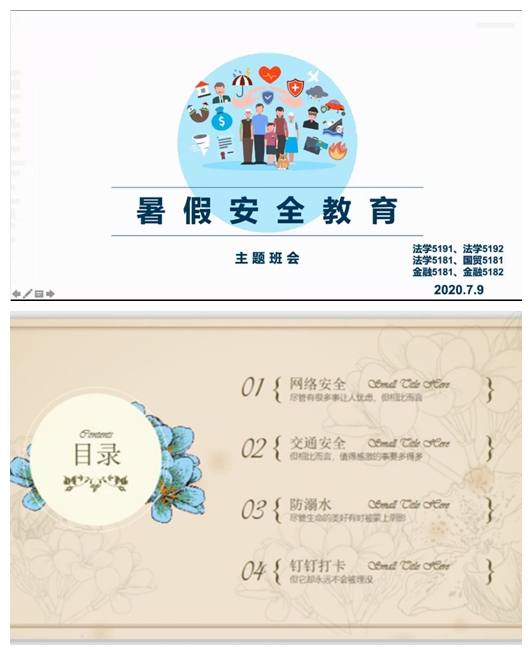 本次主题班会主要围绕“防溺水”、“防诈骗”、“防传销”、“防交通事故”、“暑期兼职安全”和“信息报备”等方面开展安全教育,旨在加强同学们假期安全防范意识,认识到安全教育的必要性。班会上,各班同学交流了近期发生在身边的安全案例,以此来警醒同学们要时刻保持警惕心理,远离危险行为。辅导员老师在总结中强调,在疫情防控常态化的新形势下,同学们要注意个人卫生,严格按照要求做好个人防疫工作;同时希望同学们合理规划假期生活,做到学习、娱乐两不误;如果因事需要位置移动一定要提前报备,有兼职的同学在工作过程中注意自己的人身和财产安全。