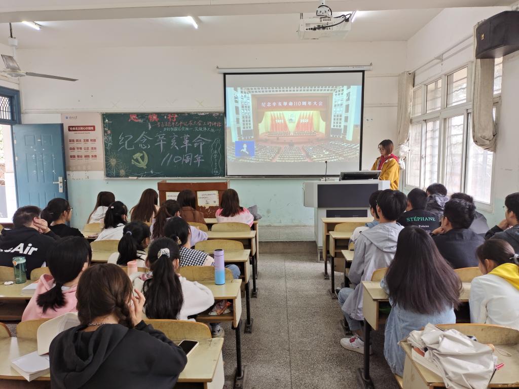 本网讯(见习记者 曾清清 胡祥 贾思雪 胡凯捷) 10月14日,经法系团总支组织各团支部开展“学习习近平总书记在纪念辛亥革命大会上的讲话”主题团课活动。纪念辛亥革命110周年,学习革命前辈的伟大精神,推进对红色历史文化的传承。