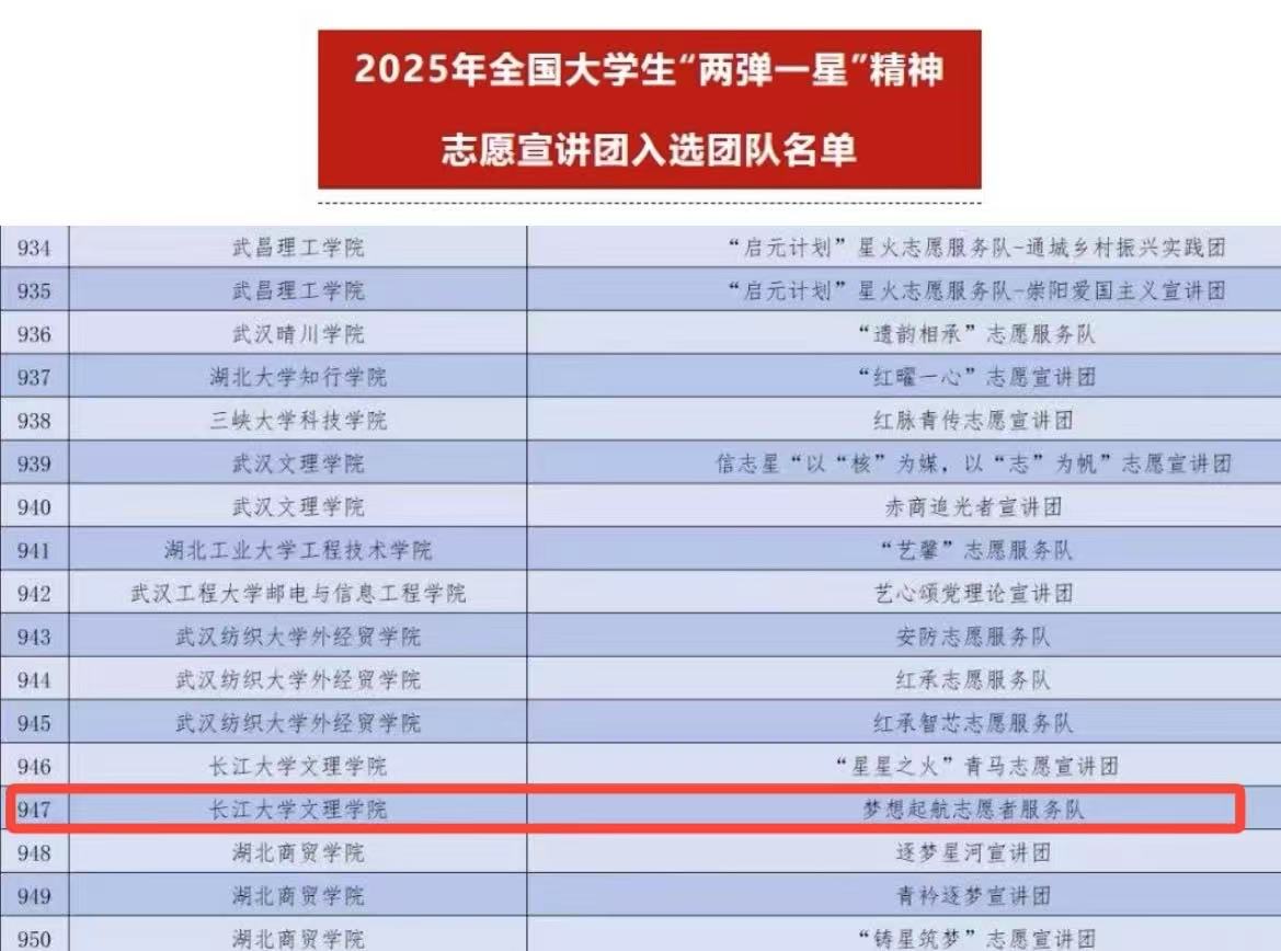 为深入学习宣传贯彻习近平新时代中国特色社会主义思想,全面贯彻党的二十大和二十届二中、三中全会精神,引导新时代广大青年学生坚定爱国报国信念,大力弘扬与传承“两弹一星”精神,激发广大青年投身强核强国事业的热情,团中央青年志愿者行动指导中心与中国核工业集团有限公司联合发布了《关于遴选2025年全国大学生“两弹一星”精神志愿宣讲团的公告》。全国共计1123所高校的5680支青年志愿服务团队提交了申报材料。主办单位对所有材料进行了认真审阅,最终遴选出1500支“两弹一星”精神志愿宣讲服务团队,经济与法学系“梦想起航志愿者服务队”从中脱颖而出。