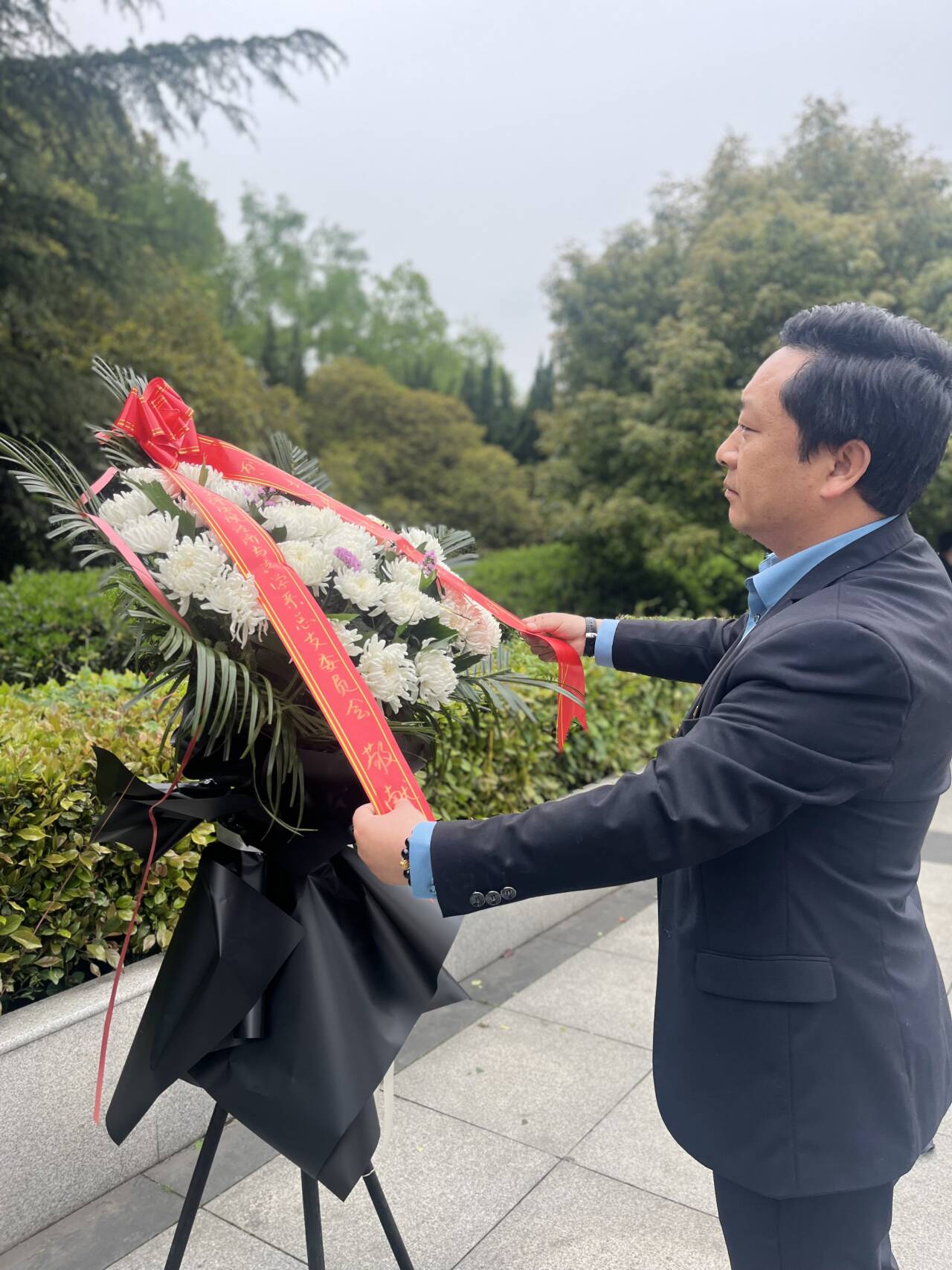 国歌奏毕,全体参与者在纪念碑前静默一分钟,缅怀烈士的英勇事迹和不朽精神,感受历史的沉重和对英雄的哀思。随后,经济与法学系满怀虔敬之意敬献花篮,辛裕上前整理缎带,向英灵以及为中国人民解放事业和国家建设事业英勇献身的烈士们,致以最为崇高的敬意,全体党员在杨杉杉带领下重温入党誓词。