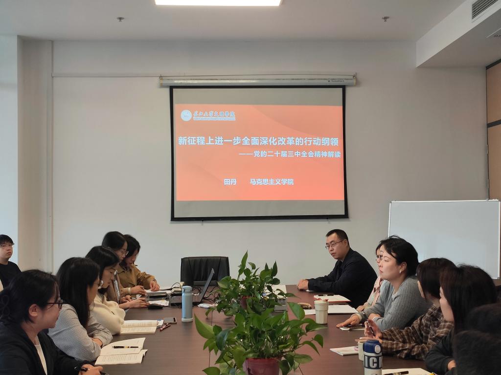 为深入学习贯彻党的二十届三中全会精神,进一步引导广大师生领会全会的重要地位、核心要义、精神实质,推动全会精神在院系落地生根、见行见效,10月17日,经济与法学系党总支在会议室举办党的二十届三中全会精神专题宣讲会。会议邀请我校马克思主义学院副院长田丹教授担任主讲嘉宾。经法系全体教职工、学生党员代表、学生干部代表参加学习,会议由党总支书记辛裕主持。