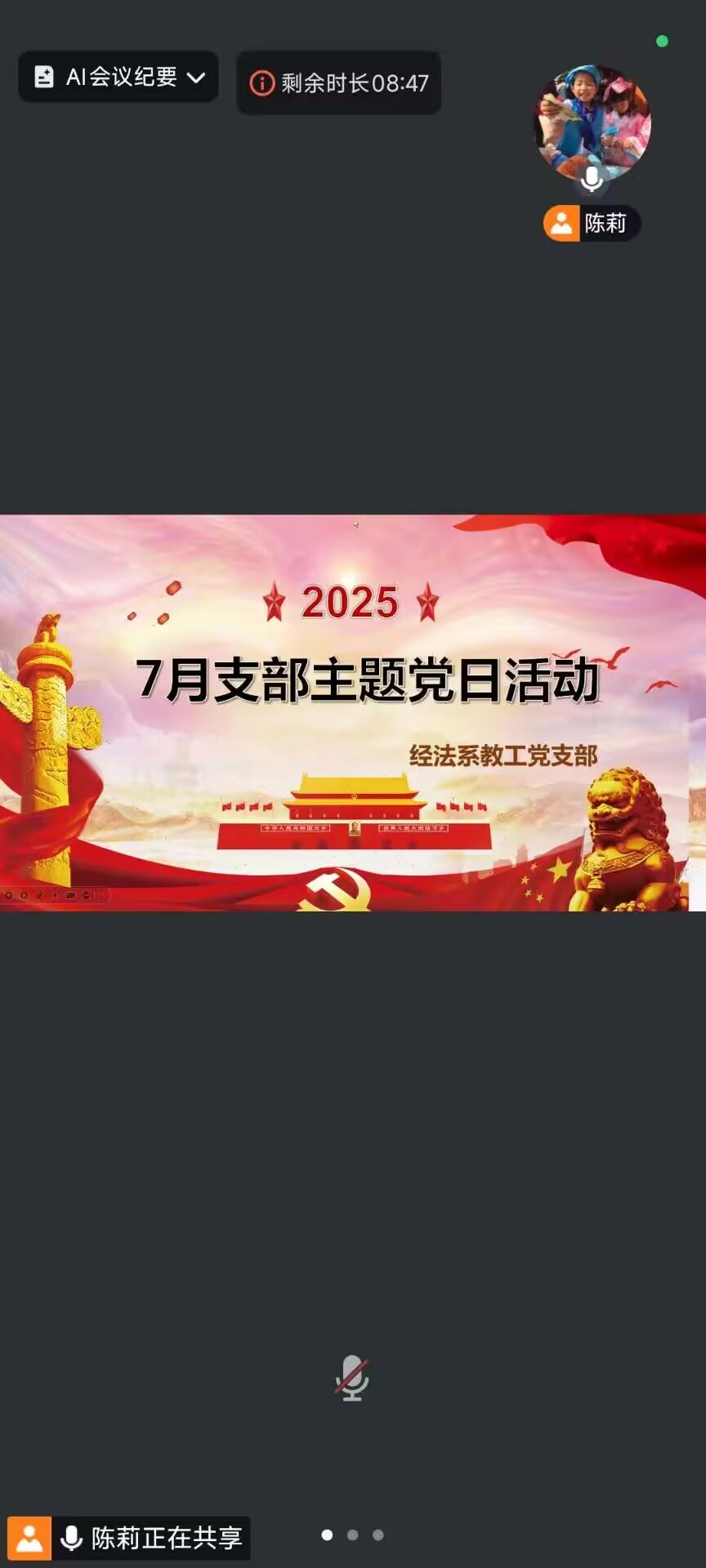 7月9日晚上19:00,经法系教工支部线上开展7月支部主题党日活动。会议由教工党支部书记陈莉主持。