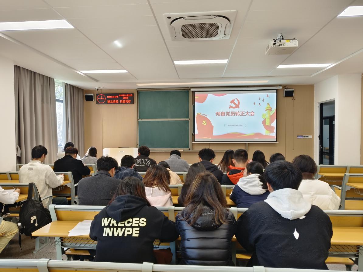 本网讯2025年11月21日下午15:00,经法系学生党支部召开全体党员大会。依次讨论曹康,王小庆,邬慧伶三名中共预备党员能否按期按转正事宜。经法系学生党支部书记杨杉杉、组织委员滕宋云、经法系辅导员卢佳智及全体党员参会。会议由经法系学生党支部书记杨杉杉主持。