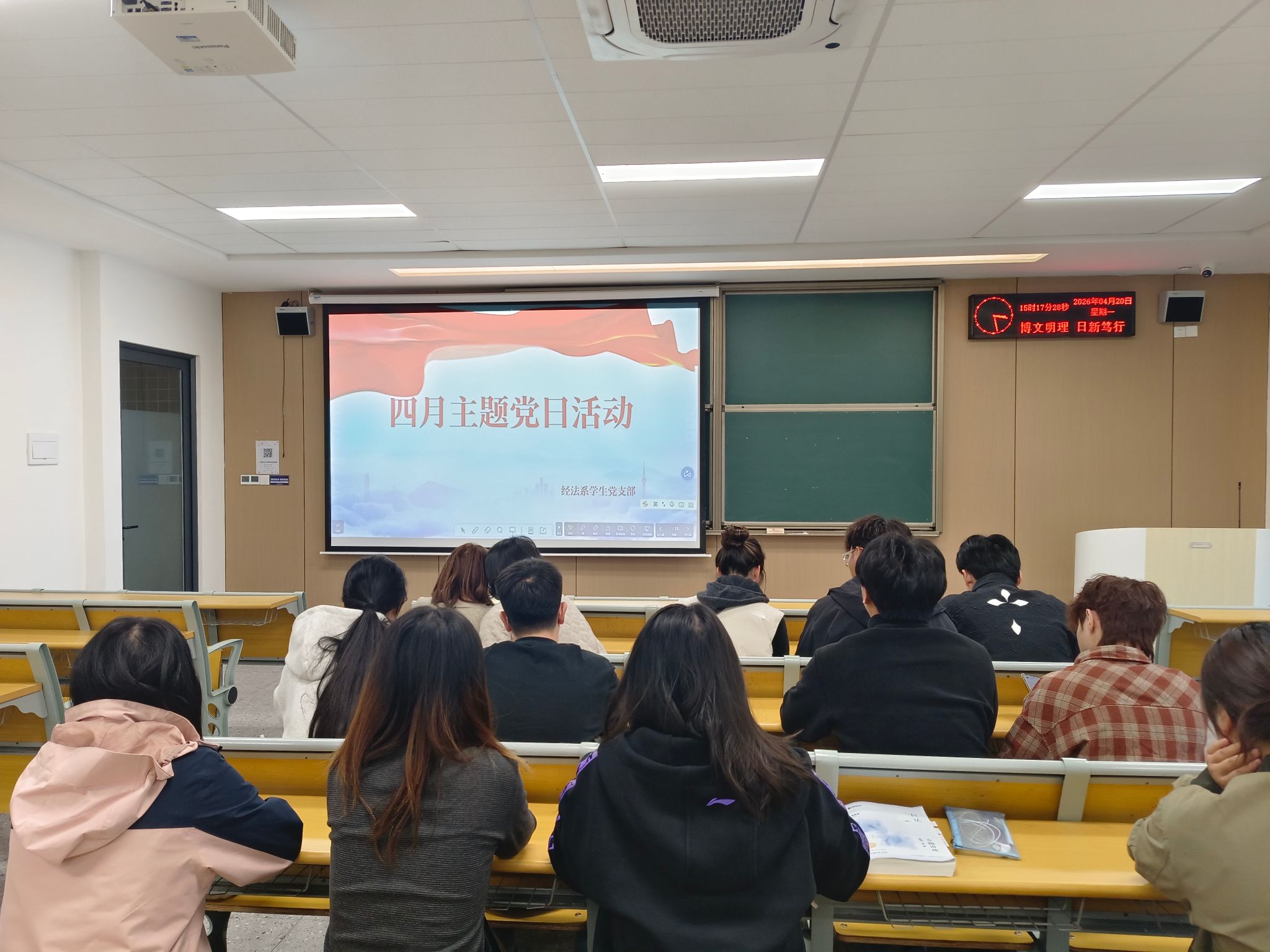 本网讯(学生记者:王小庆)2026年4月20日下午15:00,经法系学生党支部党员在教学楼C121开展4月政治学习和支部主题党日活动。